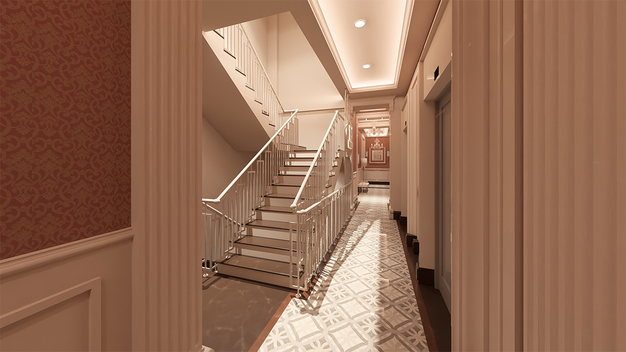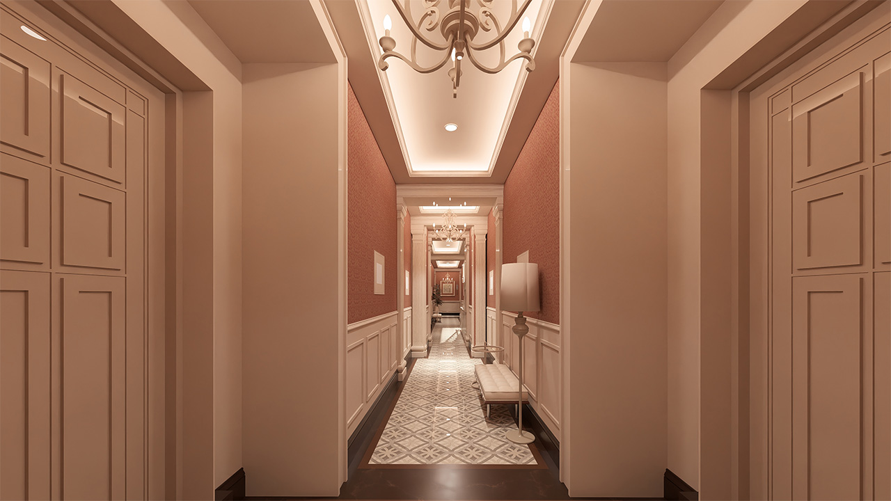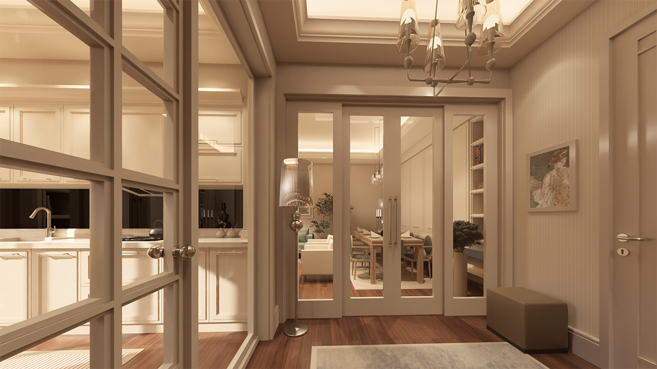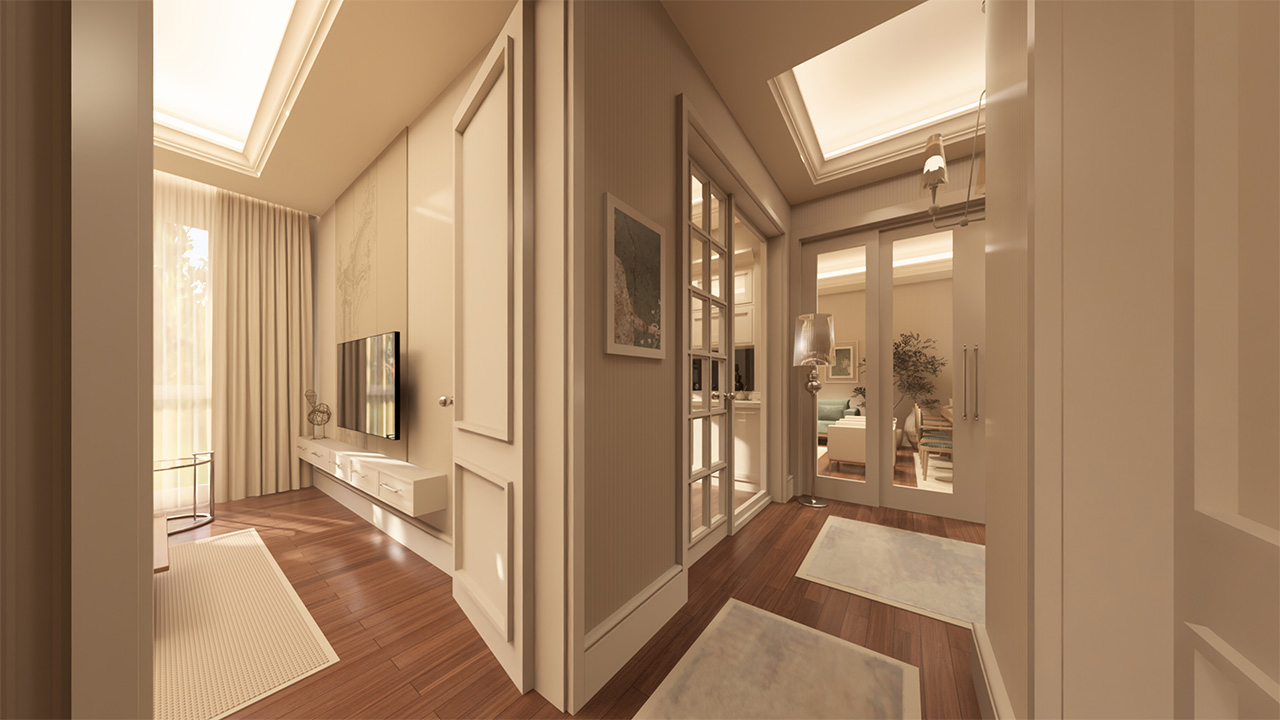 Kat koridorlarında estetik, sadelik ve kullanım kolaylığı bir arada sunuluyor. Bütünlüklü tasarımıyla ortak alanlarda da kalite hissediliyor.