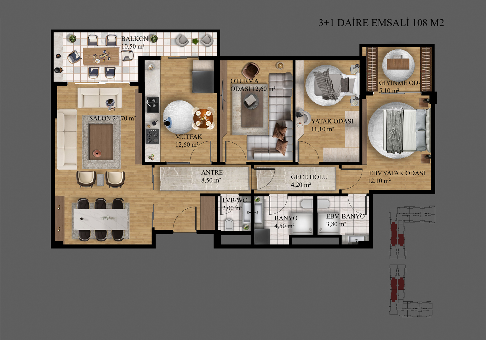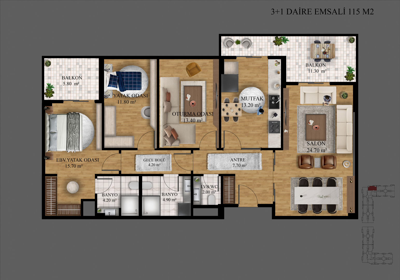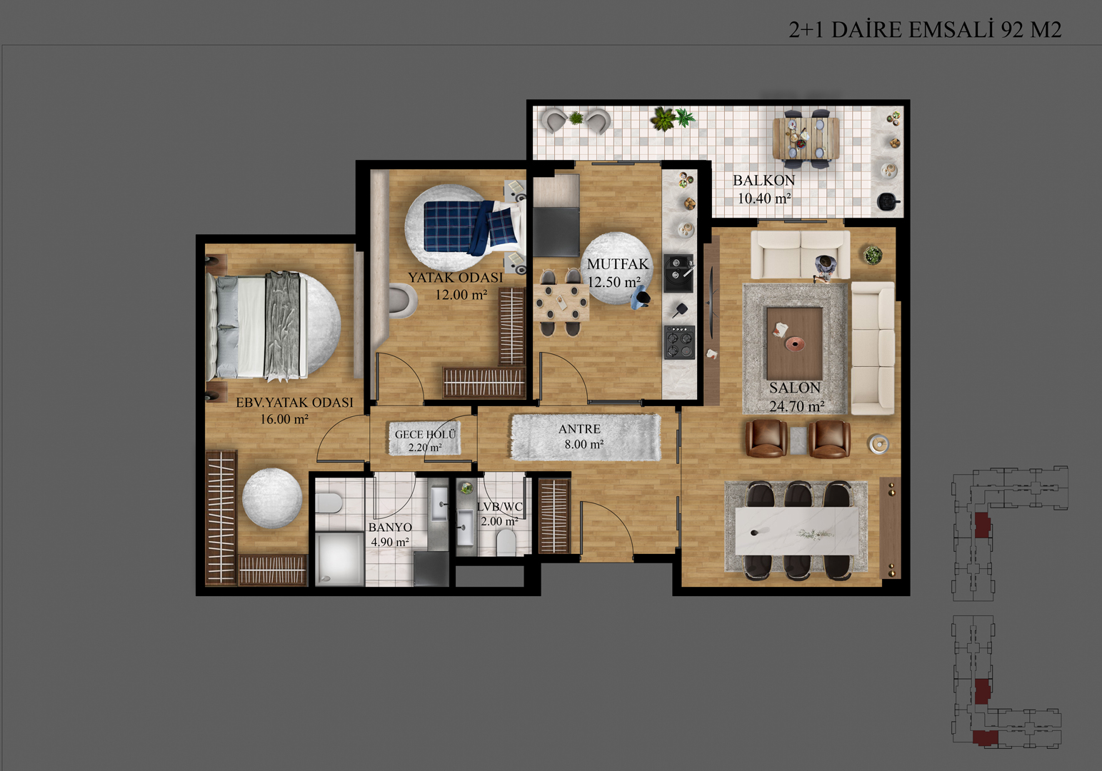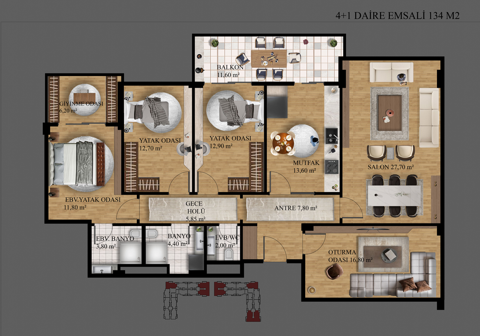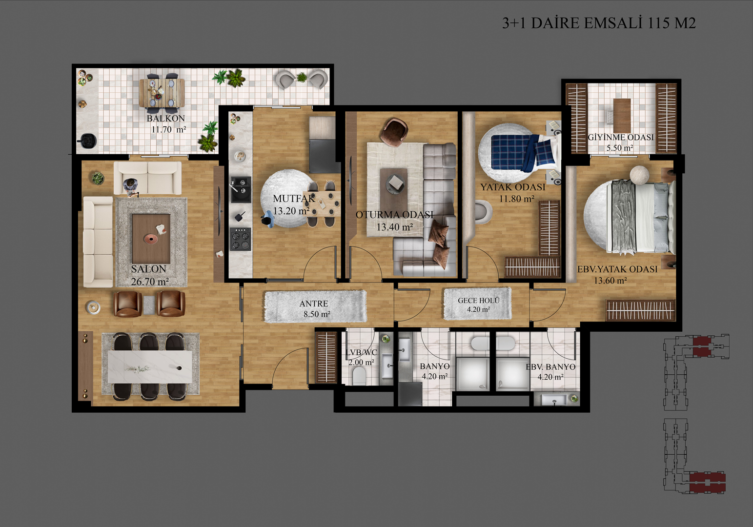 Farklı ihtiyaçlara cevap veren daire planlarıyla her aileye uygun bir yaşam alanı sunuluyor. Ferahlık, işlevsellik ve rahatlık bir arada.